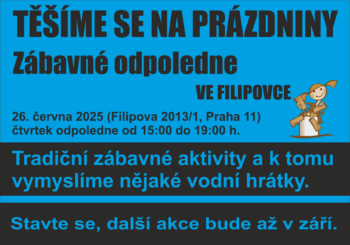 Pojďte se připravit na prázdniny. Připravili jsme tradiční pohybové aktivity a nebudou chybět ani vodní hrátky. Ideální akce pro rodiny s malými dětmi. Tentokrát nebudeme na akci dělat oheň a opékat špekáčky. Stavte se a prožijte s námi fajn odpoledne. Akce je určena rodinám s malými dětmi. Akce se koná v Komunitním, integračním a […]